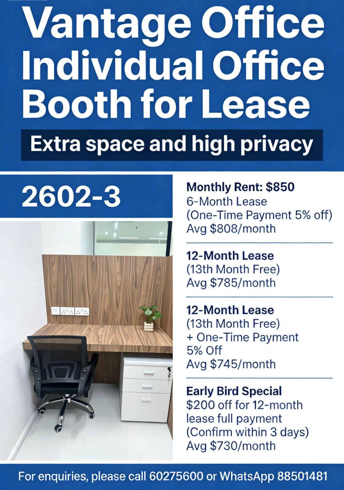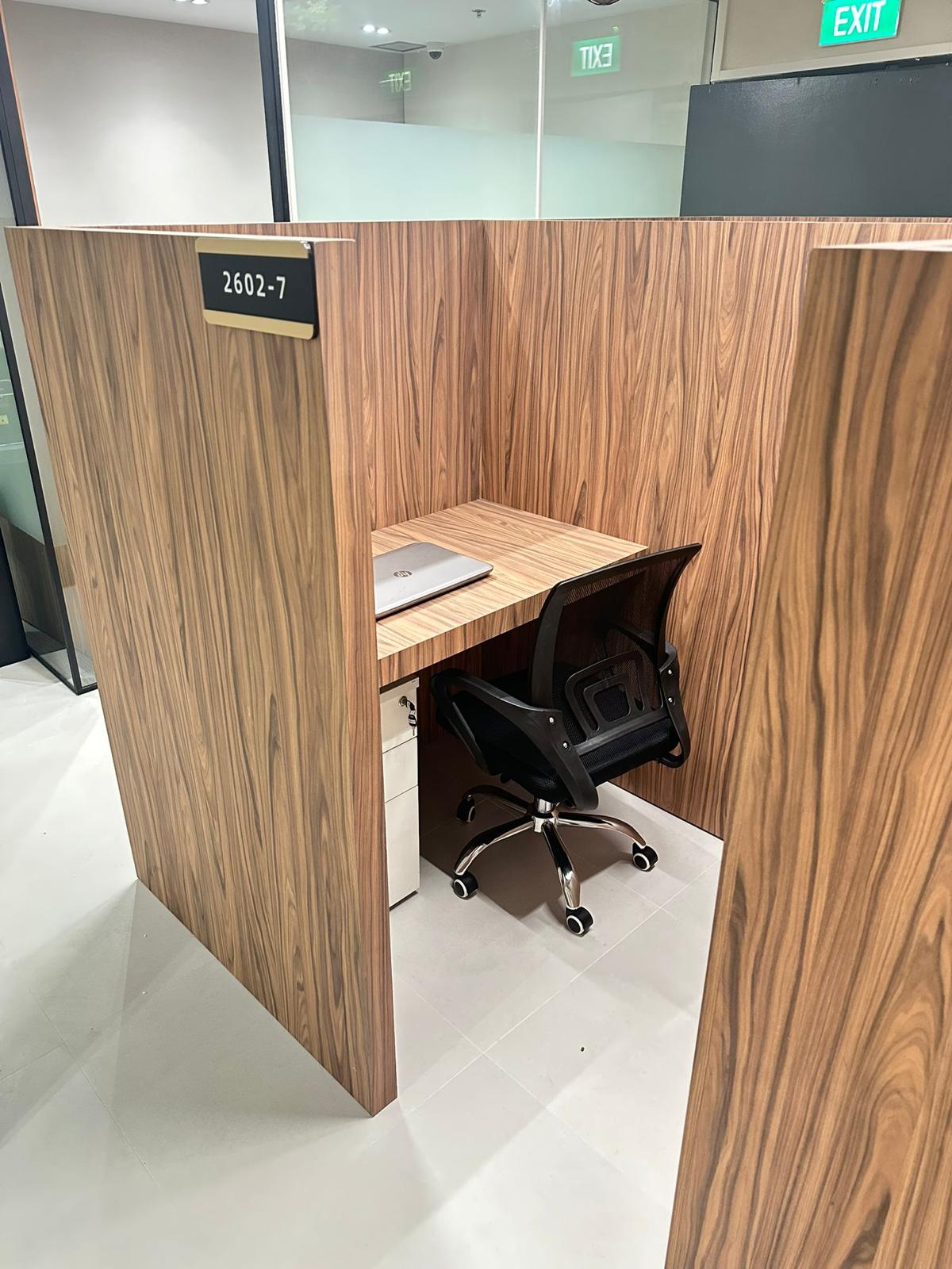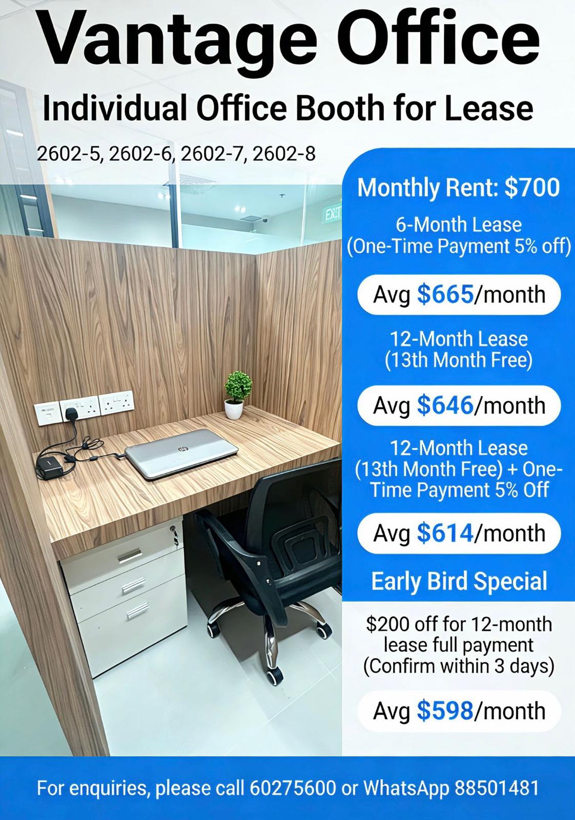 Private, high-partitioned booths at Vantage Office offer quiet, focused workspaces with ergonomic furniture, secure storage, Wi-Fi, and printing. Enjoy 24/7 access, meeting rooms, pantry perks, mail handling, and a prestigious Singapore CBD business address.